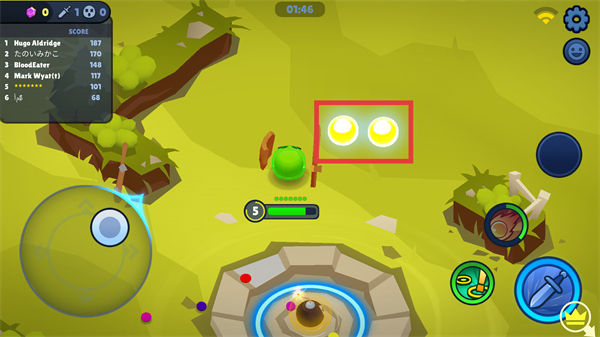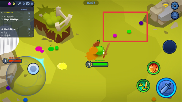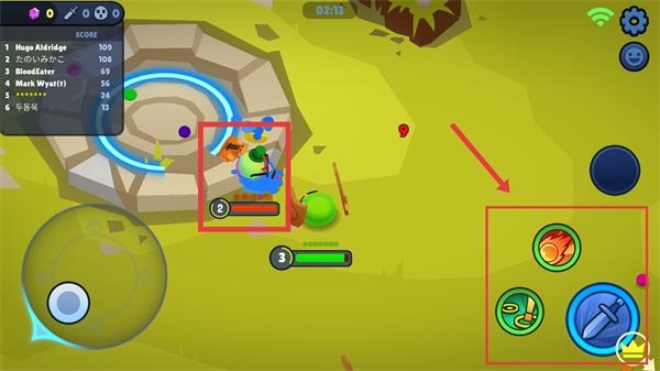 3、遇到红色框内的敌方角色时,点击红色箭头指向的【技能】按钮,发起攻击,同时关注自身等级和血量,合理使用技能。