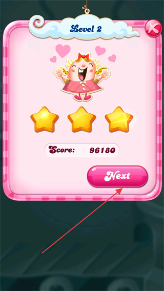 4、关卡完成后,获得三星评价和分数奖励,点击【Next】进入下一关,继续糖果消除挑战。