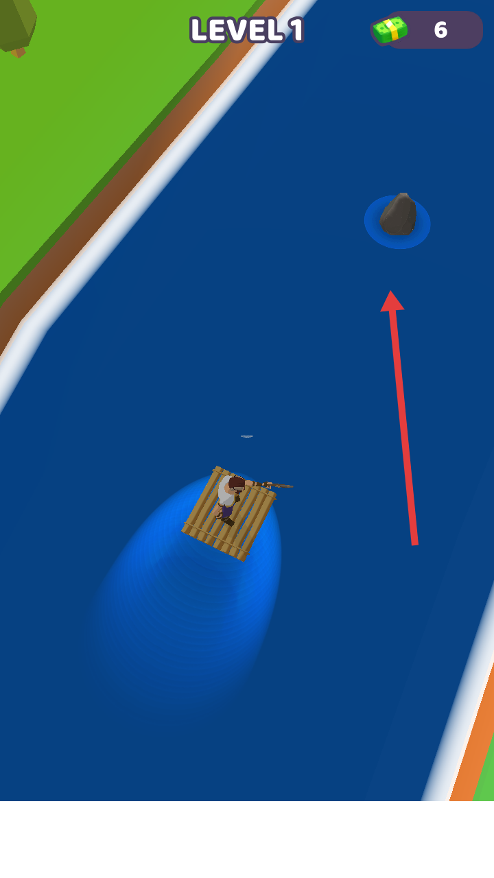 2、在河道中移动木筏,击碎黑色石头收集资源,同时避开障碍物,向目标区域推进。