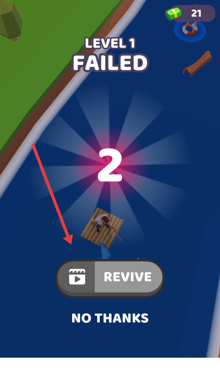 4、若关卡失败LEVEL1FAILED,可选择REVIVE复活或NOTHANKS重新挑战,调整策略以完成关卡。