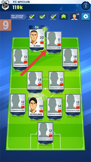 1、在球队阵容界面,查看现有球员的能力值和位置,点击箭头指向的位置进行球员签约。