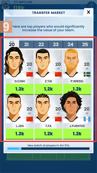 2、进入转会市场,选择能力值高的球员(如D.CHIH、Z.TAI等能力值20的球员),花费相应金币进行签约,提升球队实力。
