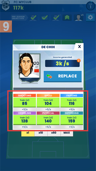 4、可对球员的射门、速度、传球、盘带、身体、防守等属性进行训练升级,进一步提升球员能力,增加球队收入。