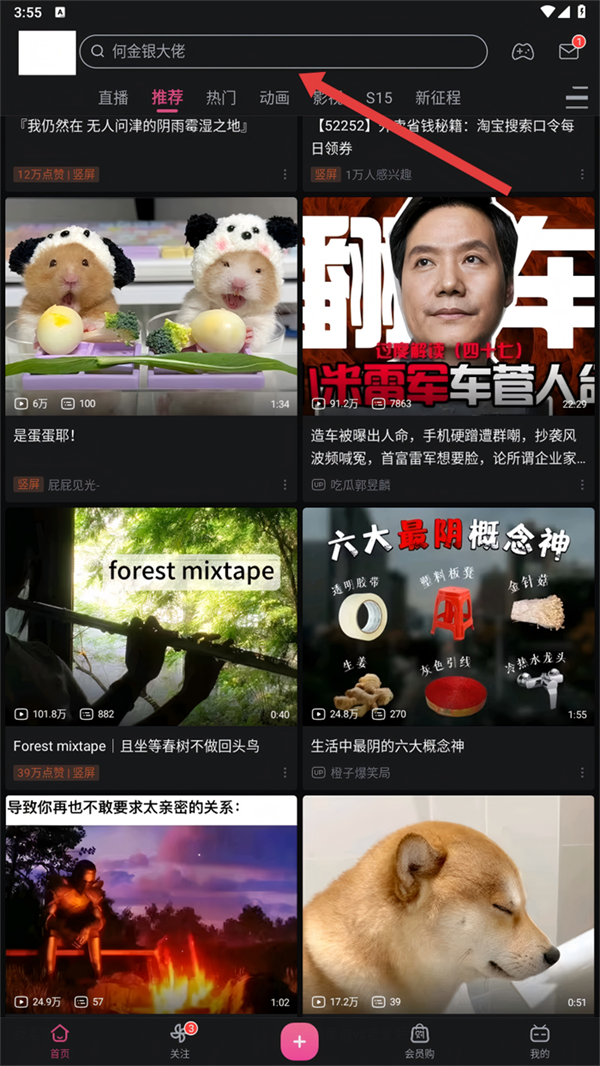 1、咱们打开【哔哩哔哩】App,点击顶部的搜索框,输入想要找的内容,这样就能开始搜索啦。
