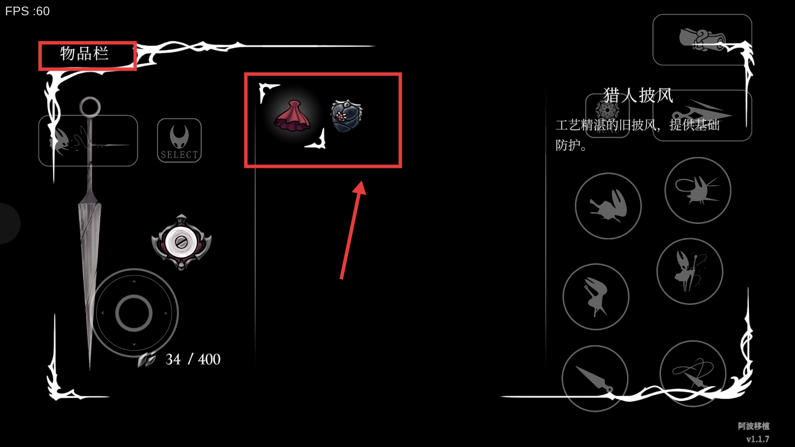 4、打开【物品栏】,查看并装备【猎人披风】等防护道具,提升基础防御应对后续强敌。