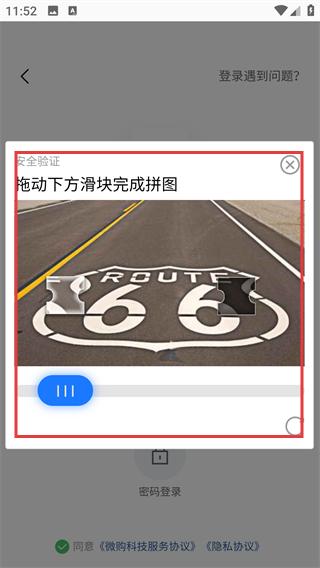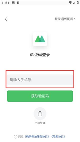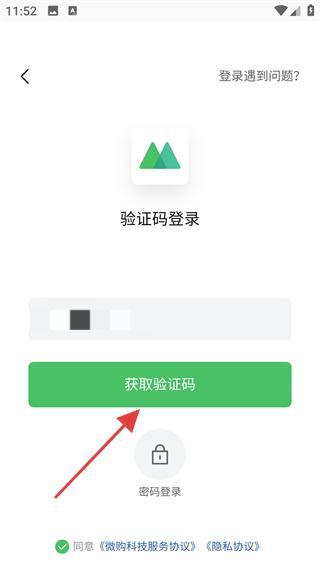 3、勾选【同意《微购科技服务协议》《隐私协议》】,点击【获取验证码】。