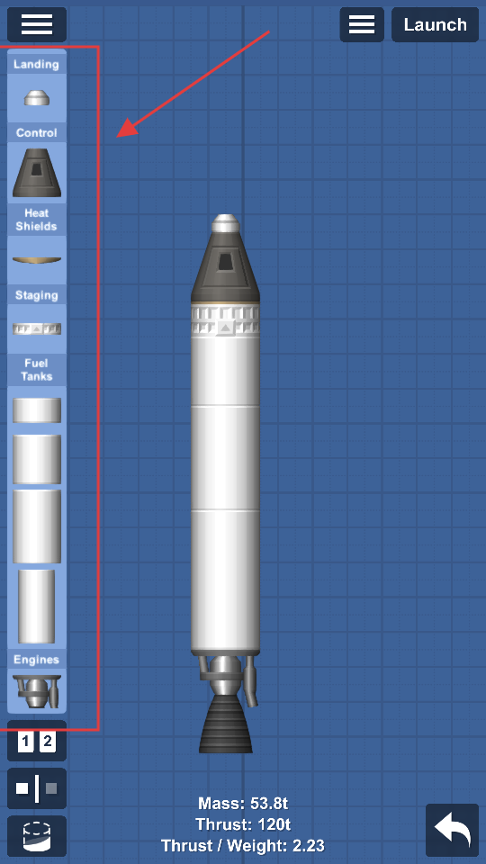 2、在发射台界面,点击【BuildNewRocket】按钮,进入火箭设计建造界面,开始选择部件组装你的专属火箭。