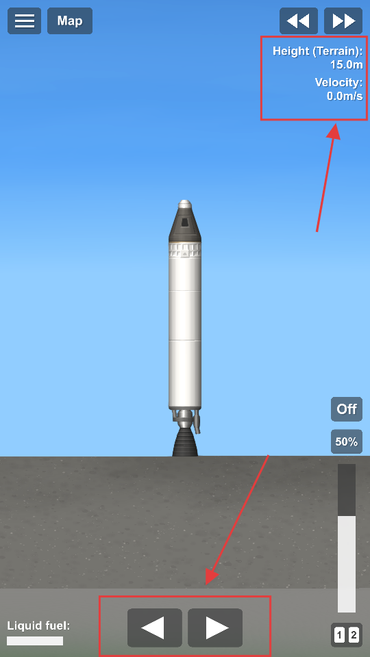 4、发射时关注右侧【Height(Terrain)】-【Velocity】数据,通过下方控制按钮调整火箭姿态,确保飞行过程稳定顺利。