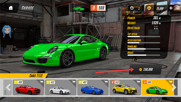 2、在车库中,可花费金币(如【150,000】)解锁新车辆,提升赛车性能。