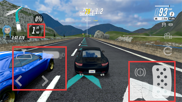 3、比赛中,利用左侧方向按钮和右侧控制按钮操控车辆,争取【1/4】的排名,注意赛道上的checkpoint提示。