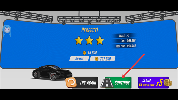4、比赛获得三星评价后,点击【CONTINUE】按钮,领取奖励,继续进行下一场比赛。