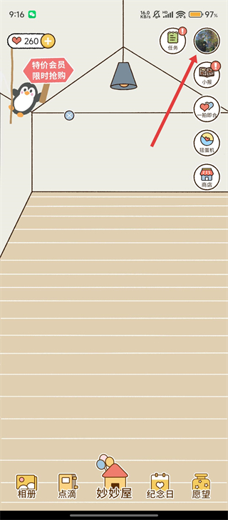1、打开卡普喔App,在【妙妙屋】界面点击右侧头像入口,进入个人页面哦。