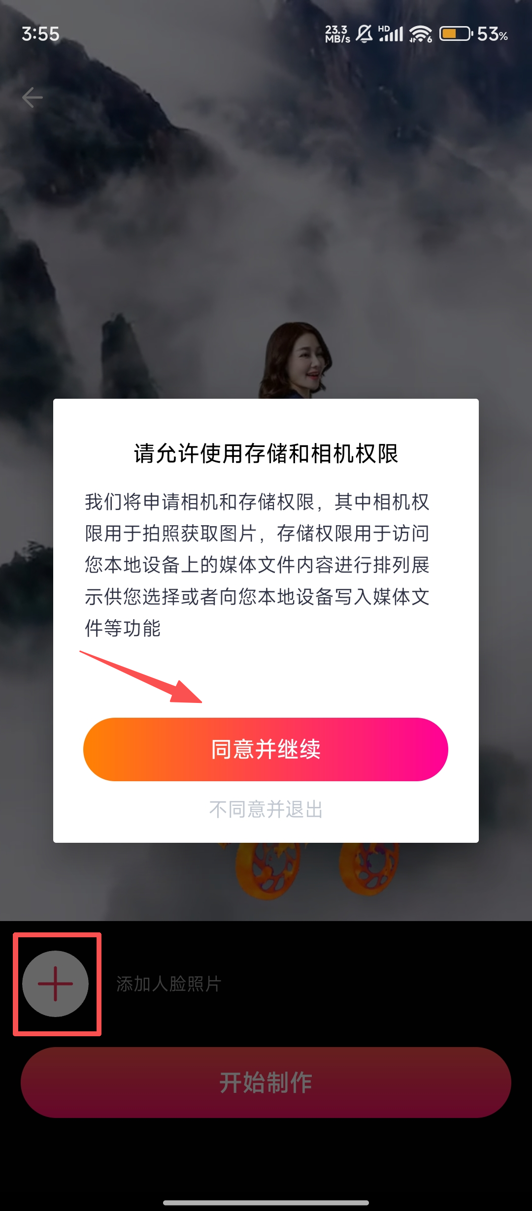 3、点击模板后,在权限申请弹窗中选【同意并继续】,让APP获得存储和相机权限,才能导入照片哦。