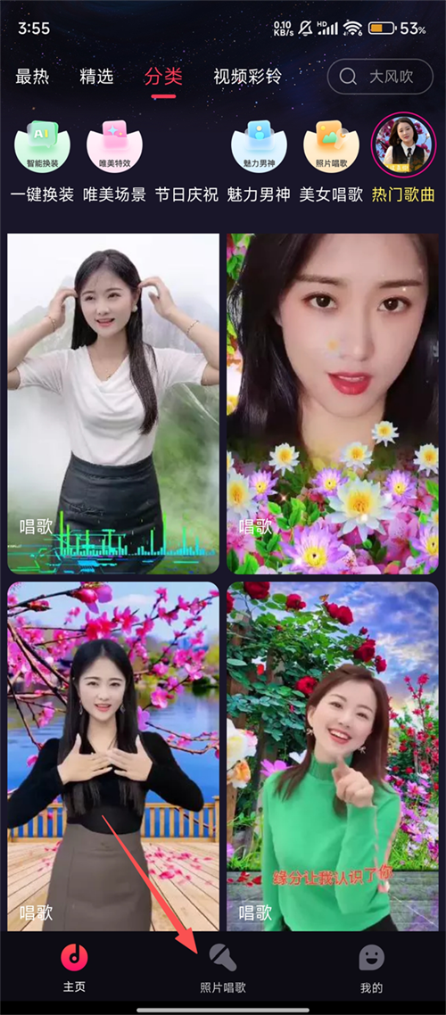 1、在【来电秀】APP,点击底部【照片唱歌】,进入功能页面哦。