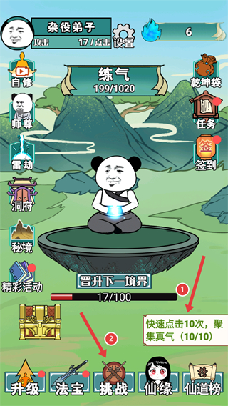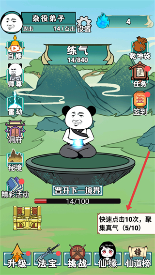 1、快速点击屏幕10次,聚集真气,完成真气聚集任务,提升练气进度。