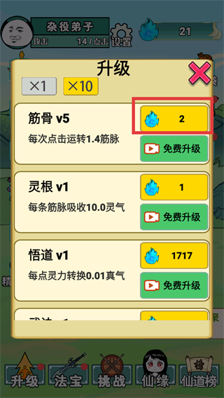 2、进入升级界面,消耗蓝色水滴资源,升级【筋骨】等属性,增强角色能力。