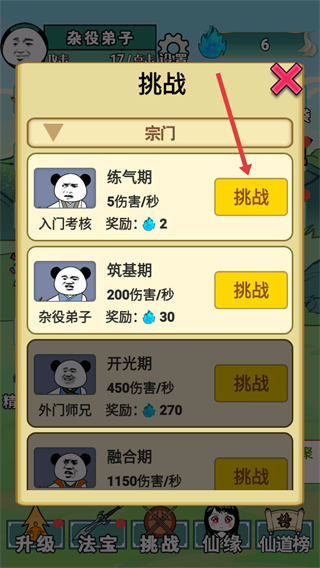 4、在挑战界面,点击【挑战】按钮,挑战练气期等宗门关卡,获取蓝色水滴奖励,提升实力。