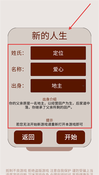 2、在【新的人生】界面,设置【姓氏】-【名称】,选择【地主】出身,点击开始进入游戏,继承田产开启专属人生。