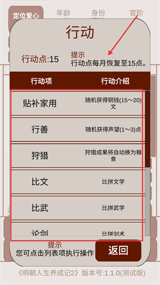 3、行动界面有【贴补家用】-【行善】-【狩猎】等选项,消耗15点行动点选择行动,获取铜钱声望或粮食等资源。