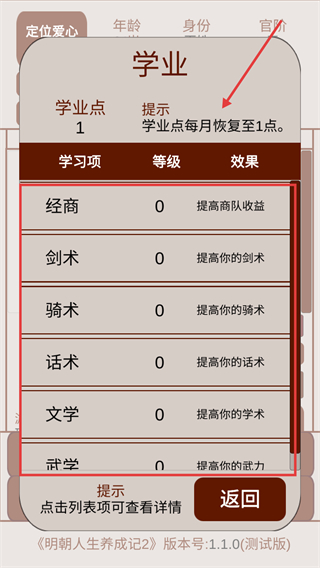 4、学业界面用1点学业点学习【经商】-【剑术】-【骑术】等技能,提升对应等级,增强商队收益或个人能力。