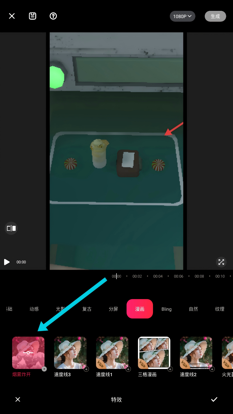 3、在特效栏中,我们可以切换到【漫画】分类,选择【烟雾炸开】特效,为视频增添趣味效果呀。