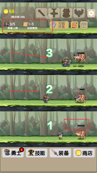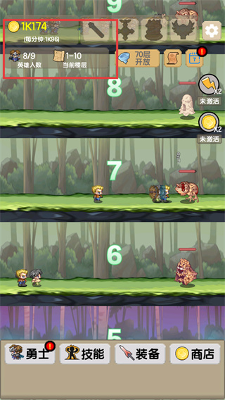 4、积累金币和分数,提升英雄人数和楼层进度(如1-10楼层),同时关注敌人的血量。