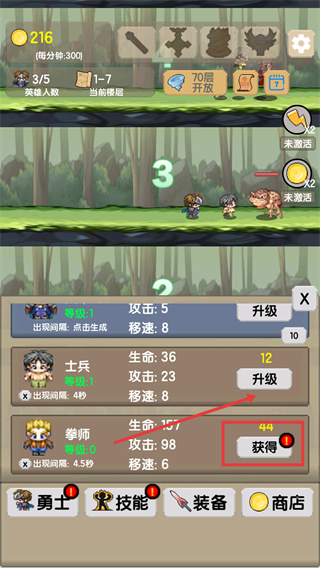 2、升级士兵或获取新英雄,提升英雄的攻击、生命等属性。
