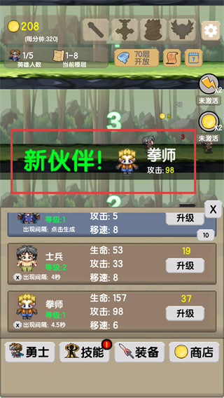 2、玩法围绕“招募勇者-升级强化-闯关爬塔”循环展开,逻辑简单清晰,没有复杂规则,专注传递休闲乐趣。