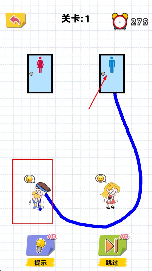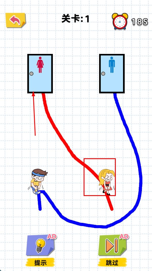 4、成功让男女角色都到达对应卫生间后,点击【下一关】,继续挑战新关卡。