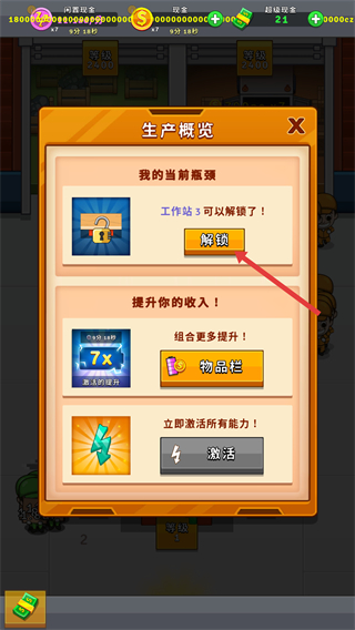 4、在【生产概览】界面,点击【解锁】按钮开启【工作站3】,同时可通过物品栏组合提升收入,激活新能力。
