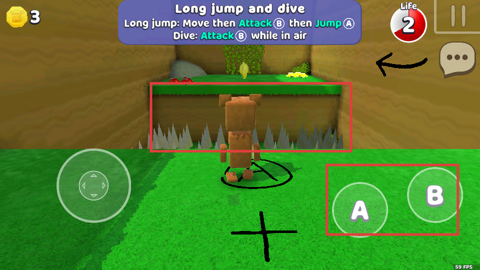 2、根据提示点击A、B键,跨越障碍,收集物品,推进关卡。