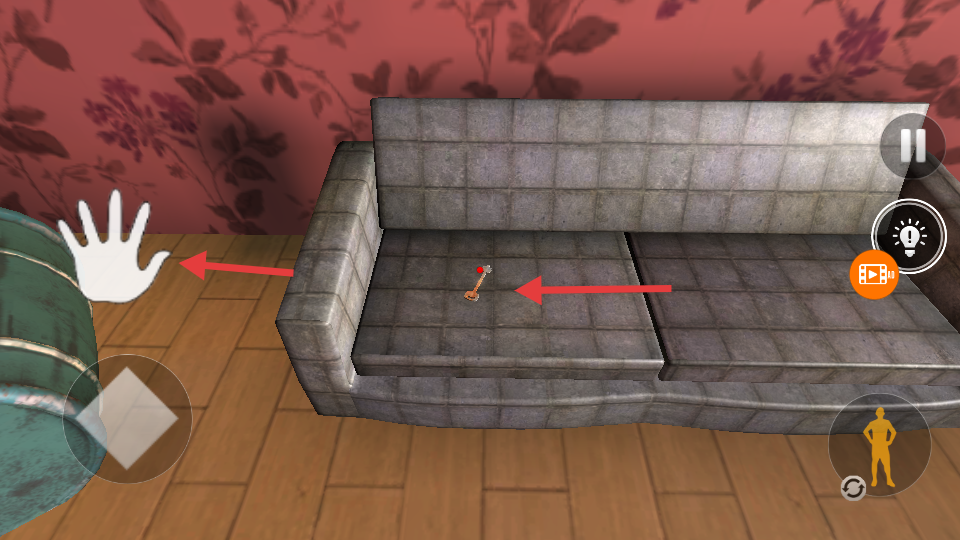 3、在沙发上发现道具,靠近后点击出现的【手掌图标】,拾取道具。