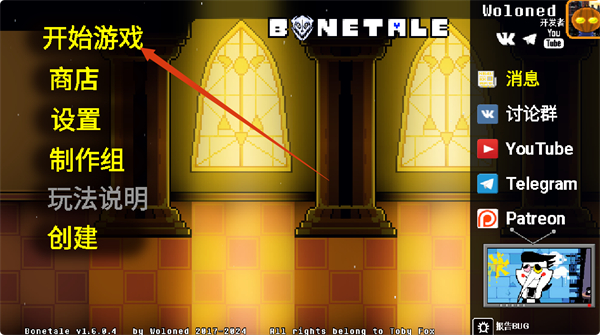 1、进入《Bonetale》游戏,点击【开始游戏】,开启像素风战斗冒险。
