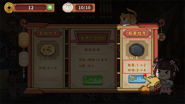 1、进入关卡前,可查看【食材信息】与【厨具信息】,用金币升级厨具提升效率,助力完成【关卡1-2】目标。