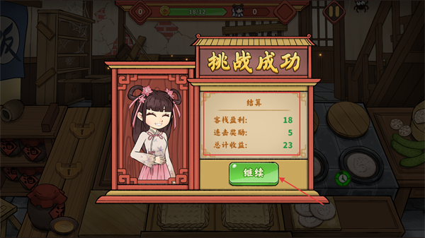 4、挑战成功后查看【客栈盈利】与【连击奖励】,点击继续进入下一关或返回修缮客栈。