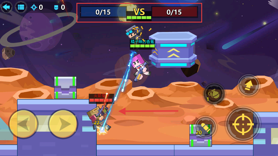 1、红蓝双方比分为0/15时,利用道具增强火力,灵活移动躲避敌方火箭兵攻击。