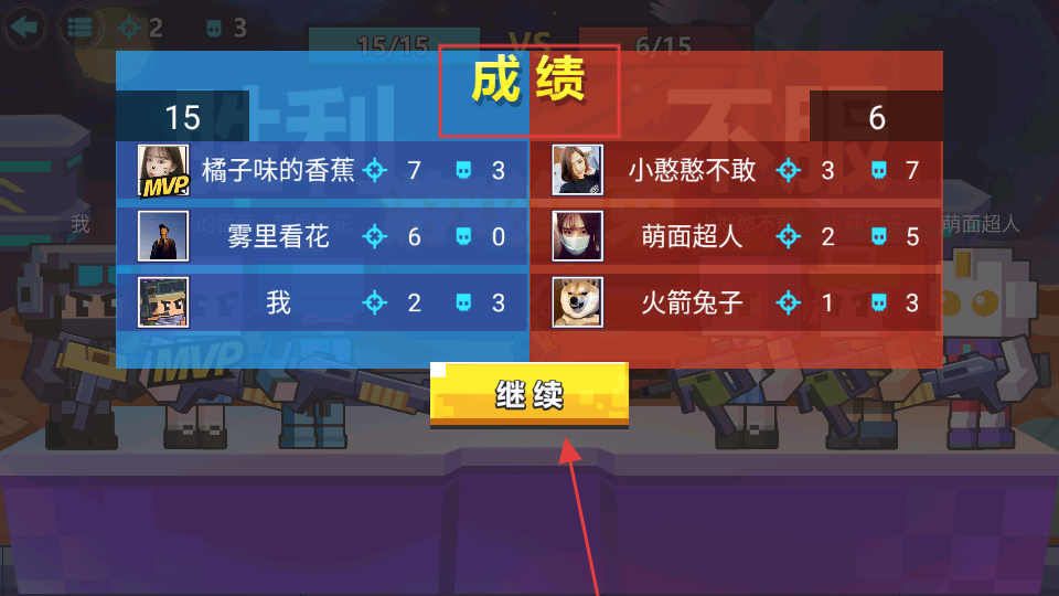 3、对战结束后查看成绩界面,确认MVP及队友数据,点击【继续】按钮进入下一流程。