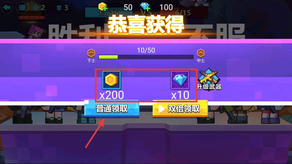 4、完成对战后领取奖励,点击【普通领取】获【x200】-【x10】资源,积累升级武器提升战力。