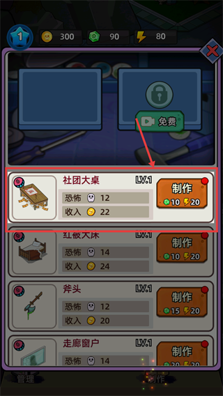 3、在制作界面选择【社团大桌】,消耗对应资源点击制作,提升鬼屋恐怖值和收入能力,吸引更多游客。