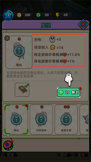 4、在鬼怪界面选择【笔仙】,消耗资源点击解封,提升场馆收入和游客吓晕概率,增强鬼屋惊吓效果。