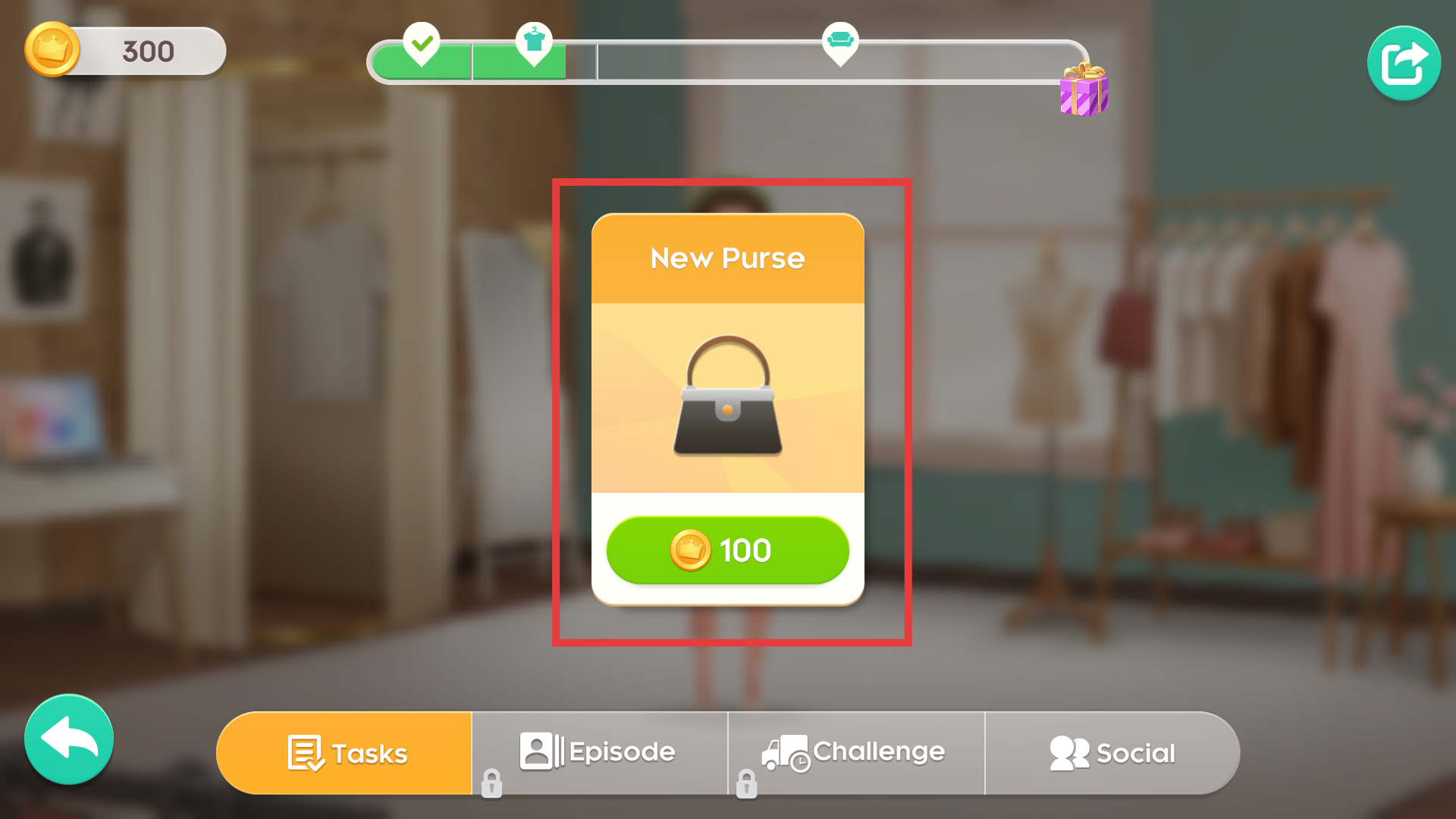 1、建议花费100金币购买【NewPurse】新钱包,丰富角色配饰选择,助力后续时尚搭配任务推进。