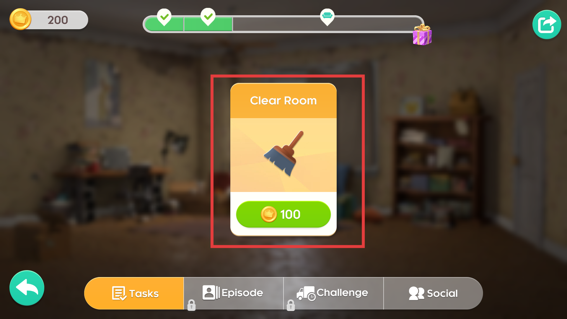 3、使用100金币完成【ClearRoom】清理房间任务,保持环境整洁,解锁更多房间装饰升级选项。
