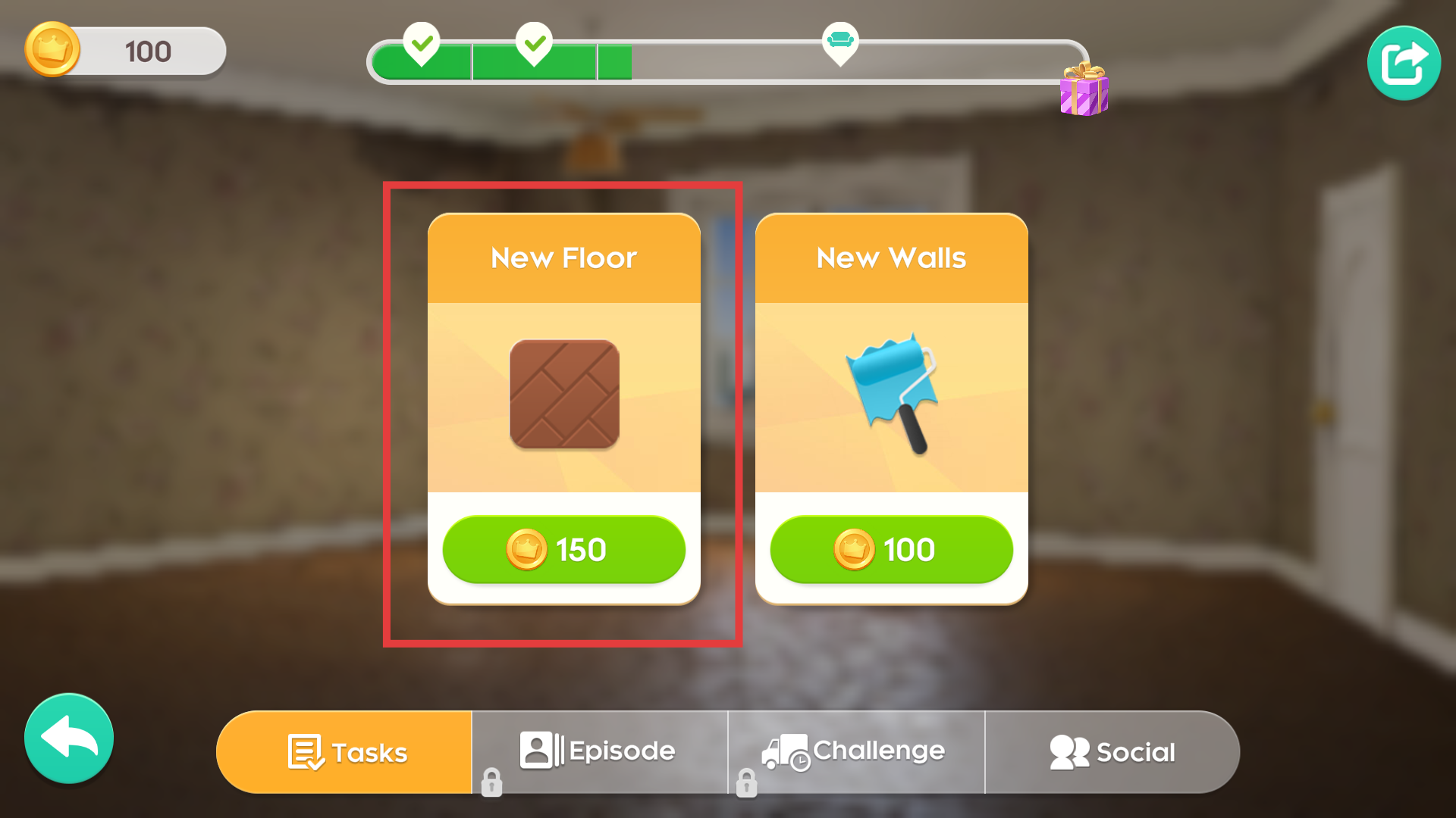 4、根据金币数量选择【NewFloor】,更新房间地板或墙壁,提升空间美观度推进任务。