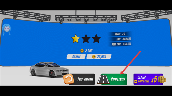 4、比赛结束后,点击【CONTINUE】按钮,领取奖励,继续进行下一场比赛。