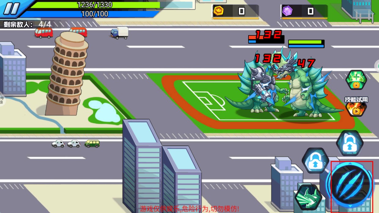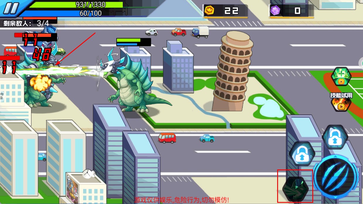 4、使用右侧【绿色范围技能】触发群攻,同时打击多个敌人提升清场效率,加速战斗。