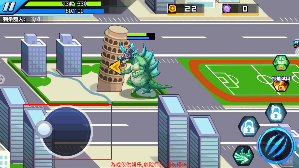 3、通过左侧【移动摇杆】控制怪兽移动,跟随箭头指示靠近目标,准备发起攻击。