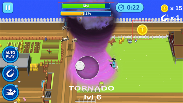3、吞噬过程中收集金币,用于解锁和升级道具(如加速、磁铁),增强龙卷风的吞噬效率和能力。