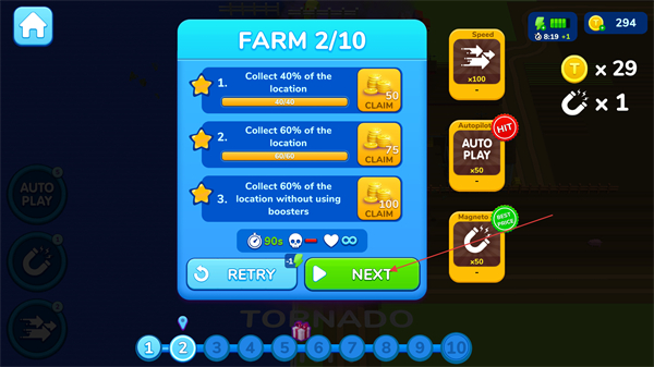 4、关卡完成后,点击【NEXT】进入下一关,积累关卡完成经验,解锁更多区域和道具。