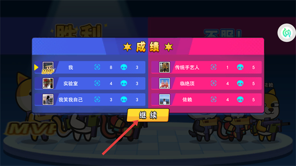 4、对战结束后查看战绩面板,点击【继续】按钮可返回主界面或开启新的对战。