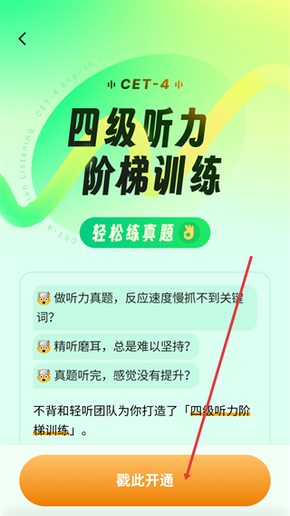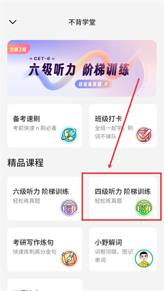 2、在【不背学堂】页面中,找到【精品课程】板块里的【四级听力-阶梯训练】,点击进入该功能。
